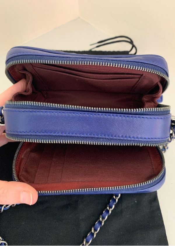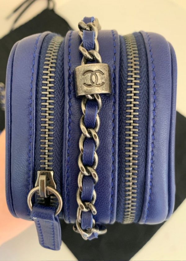 The Chanel Coco Boy Camera Bag Mini is a crossbody bag crafted from blue leather featuring antiqued silver-tone hardware, chain-link shoulder straps, and a double zip closure at the top. The canvas interior features one zip pocket and multiple card slots. Made in Italy. Includes dust bag.