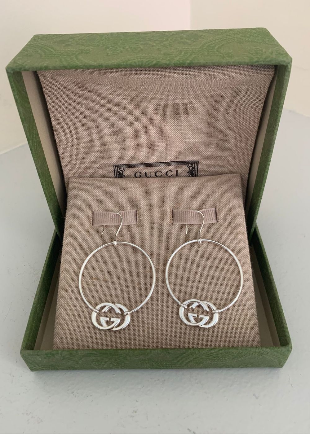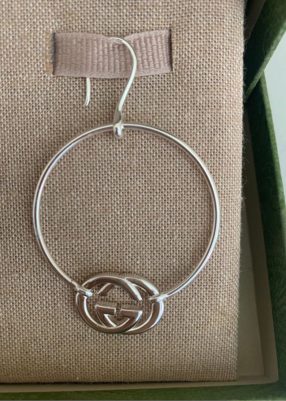 These new Gucci GG Logo Britt Hoop Earrings are crafted from sterling silver and feature a thin hoop with the interlocking GG logo connected at the bottom. Made in Italy.
